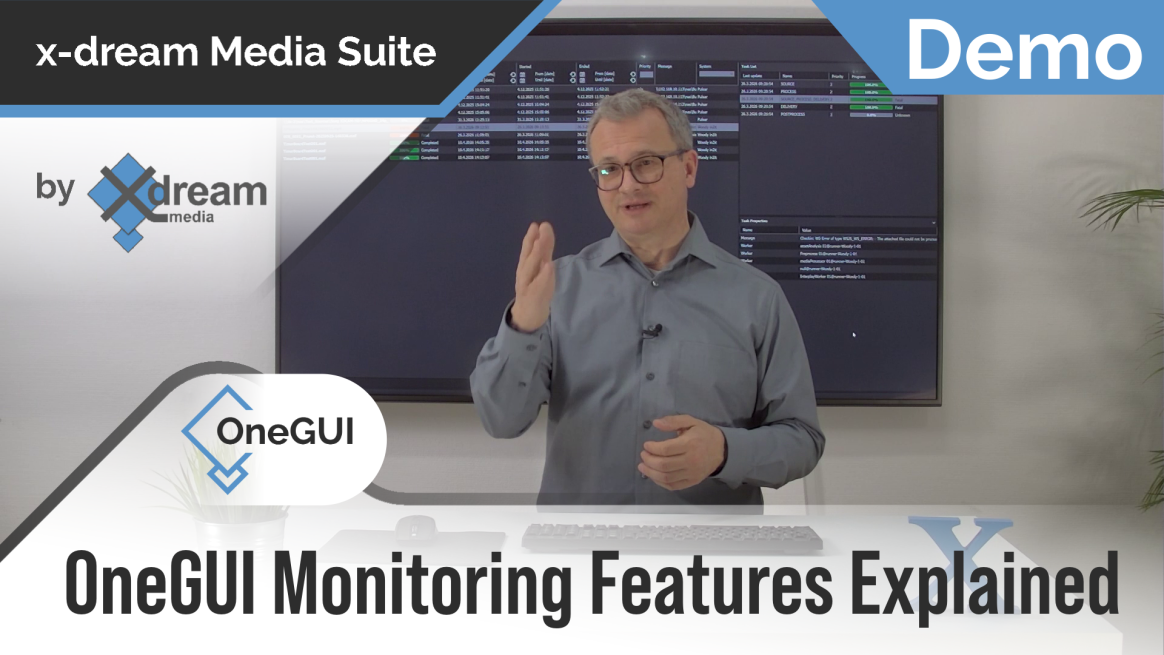 OneGUI is a powerful monitoring add-on to nearly every job-based media processing software. It can be used to show the job list in ingesters, transcoders, video standard converters, audio processors, re-wrappers or QC tools as well as workflow systems.